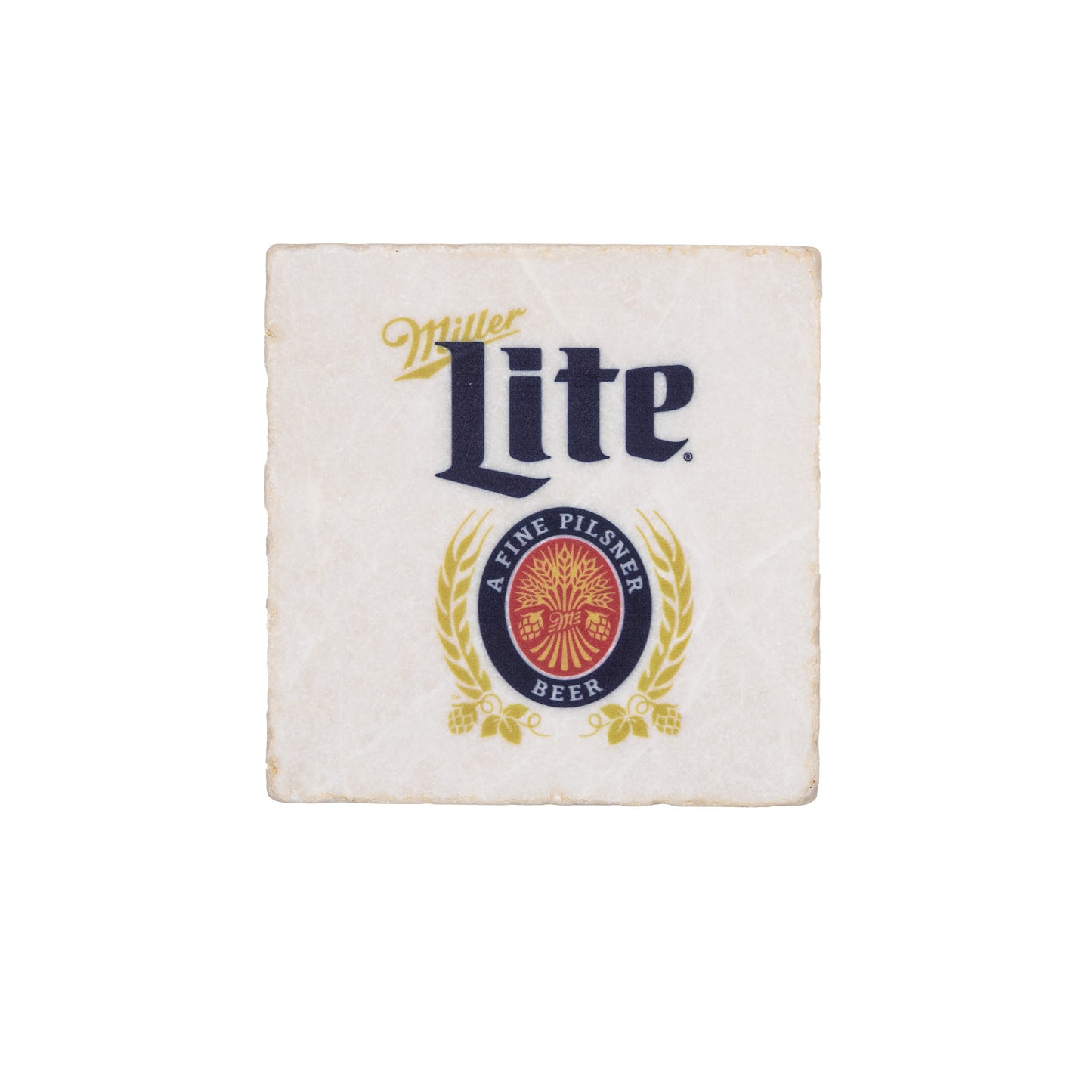 | Miller Lite marble coaster with iconic crest graphic. Dimensions: approximately 4" x 4" x 1/4" with cork backing. Sold individually. |