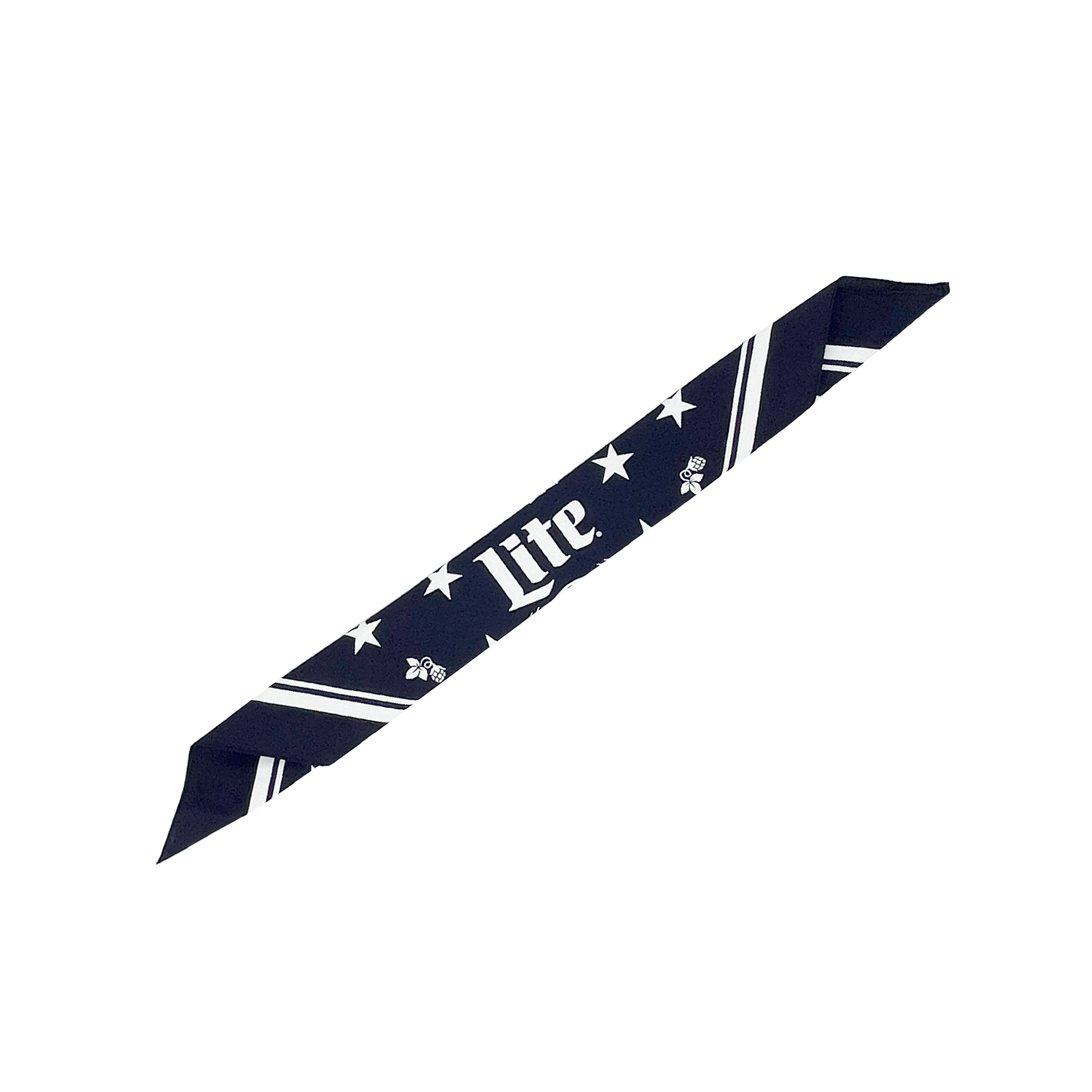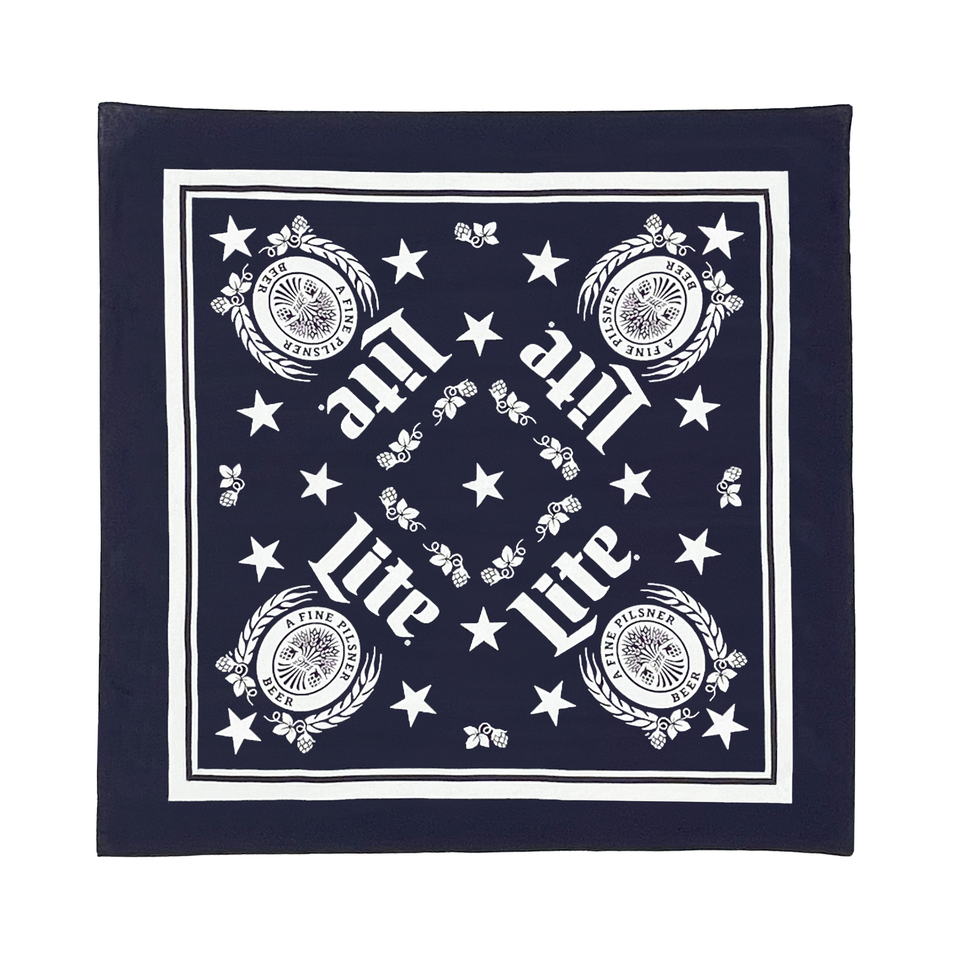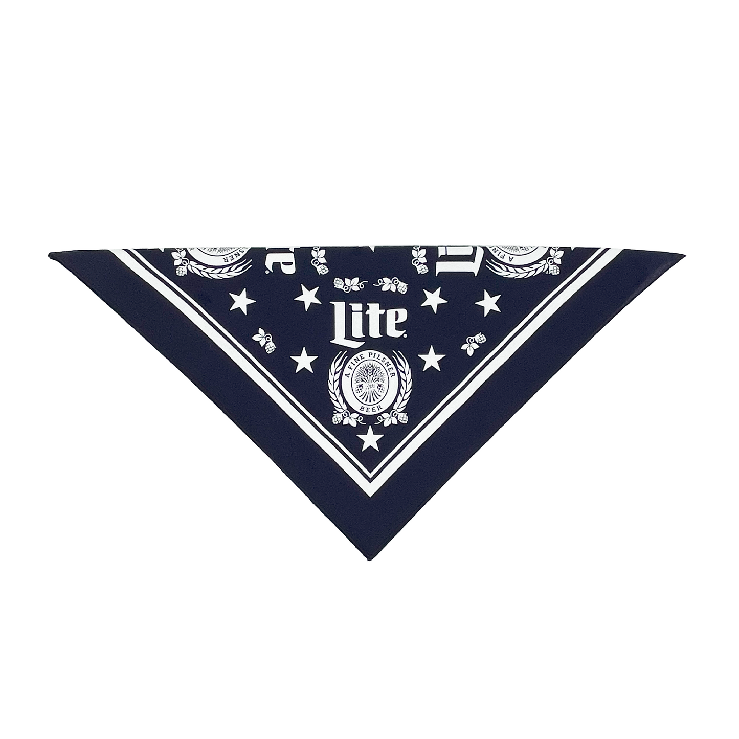 This navy bandana features the iconic Miller Lite crest and can be worn in countless fun ways—around your neck, as a headband, or tied to your bag.