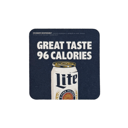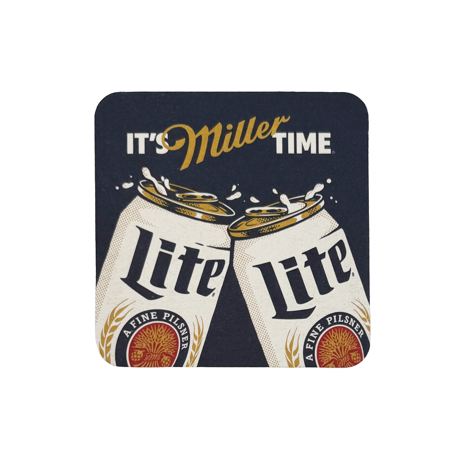 Miller Lite 125-pack standard cardboard coaster set featuring 'It's Miller Time' Cheersing Cans graphic.