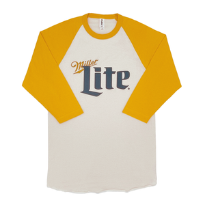 Step up to the plate with the Miller Lite Baseball Raglan Tee. This tee features 3/4 length gold sleeves and a raw hem, for an ultra-relaxed fit. Made with 100% cotton.