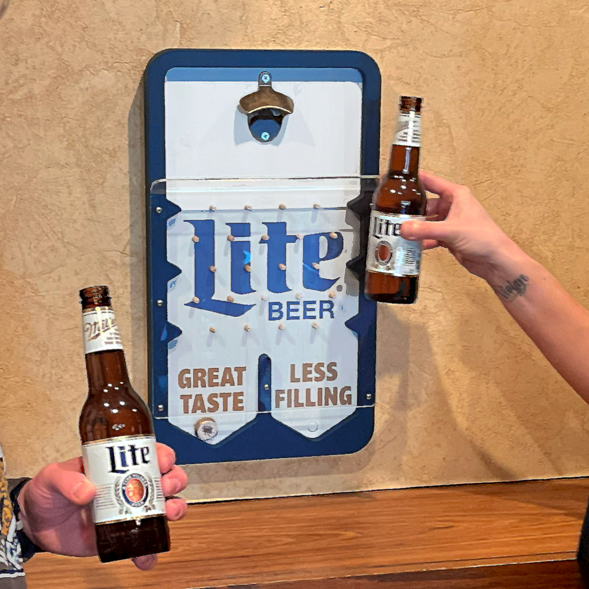 Pop open your ice-cold Miller Lite bottle using the opener at the top of the board. Then watch as the bottlecap drops, zigs and zags to the magnetized bottom and settles the great debate, once and for all!