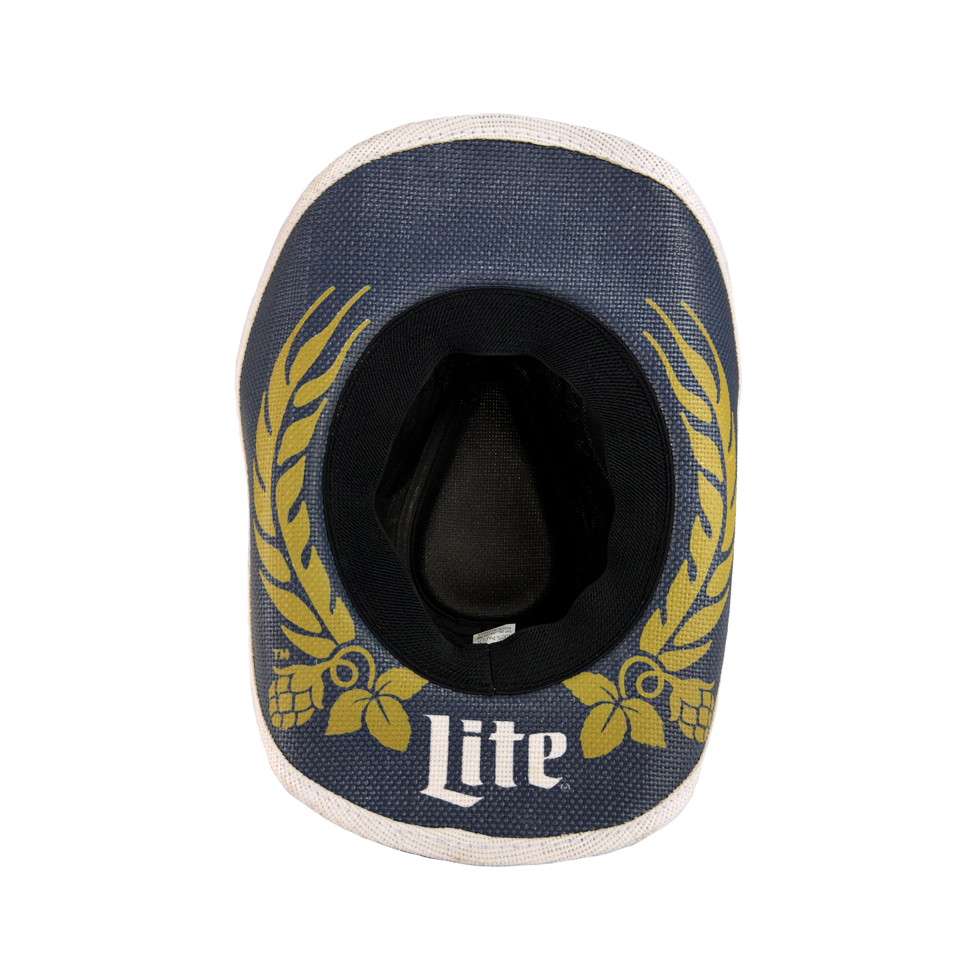 All over print Miller Lite cowboy hat with inside elastic headband to help fit most head sizes.
