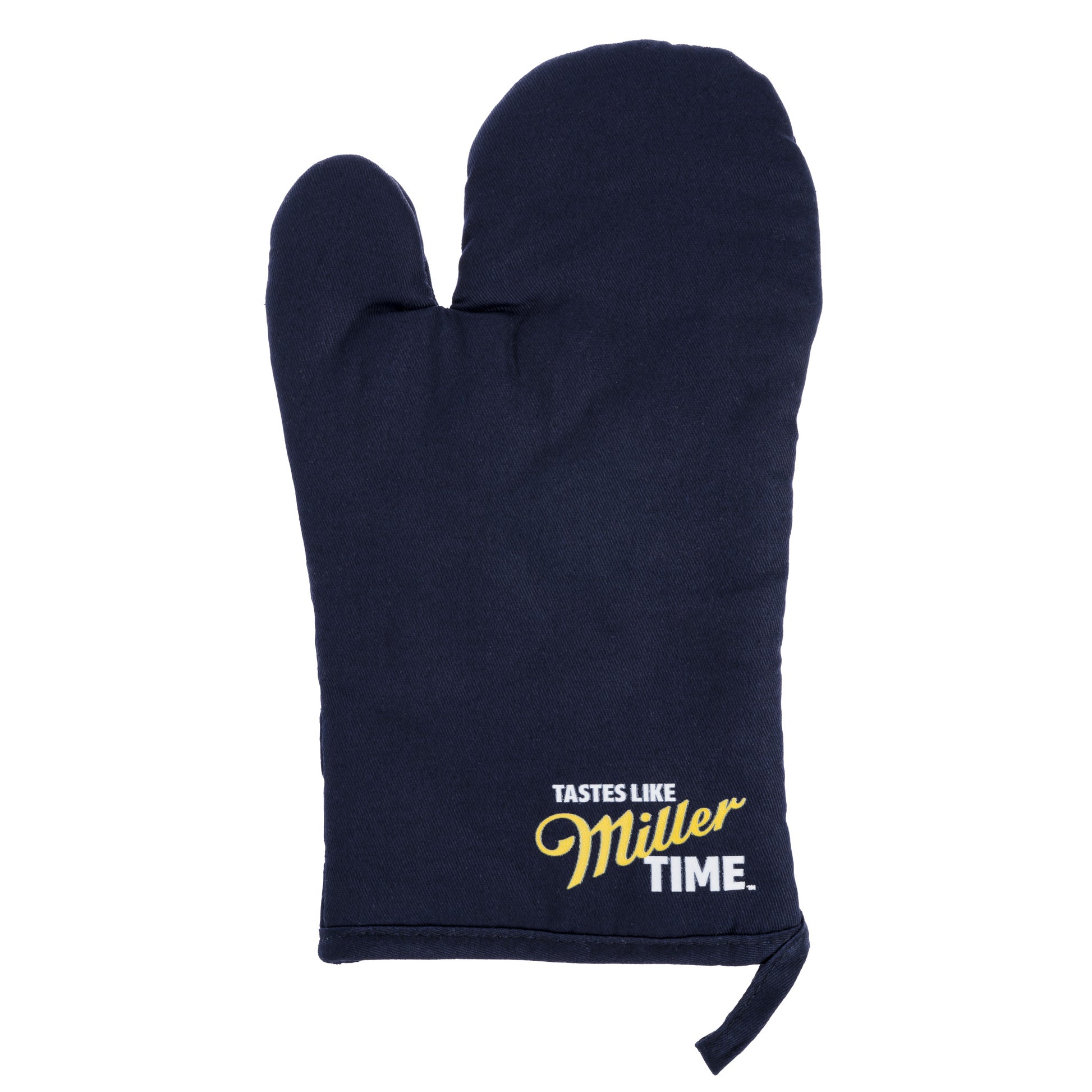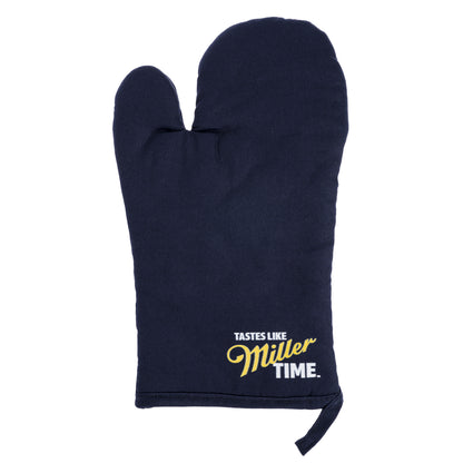 Grill out in style with this protective grilling mitt. Includes 'Tastes Like Miller Time' logo and hanging loop for easy storage.