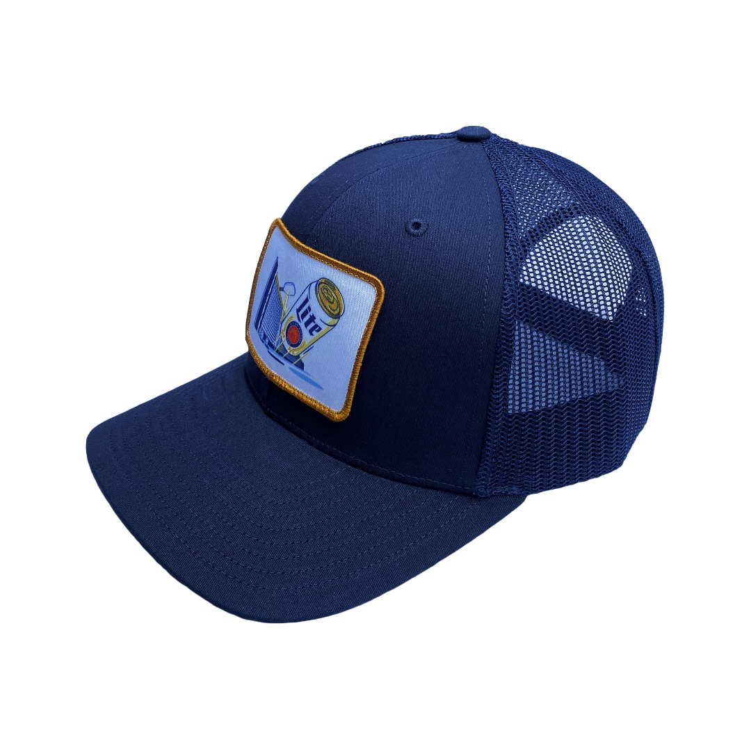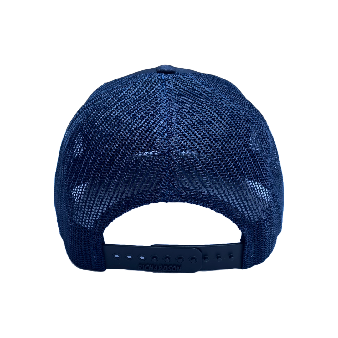 Navy cotton/poly, nylon mesh back, mid pro trucker cap. Includes pre-curved visor, cotton sweatband and adjustable snap back closure.